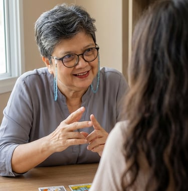 Não vim de família de tarólogas. Vim da academia - sou formada em Psicologia. E foi justamente isso que me fez diferente: aprendi a ler não apenas as cartas, mas a alma por trás de cada pergunta.